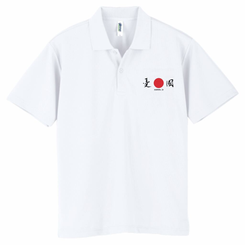 『yuukoku=憂國・jp=日本』のメッセージをドメインとデザインに反映させた受注生産のポロシャツです。吸汗性に優れ、UVカットな上に通気性抜群のドライメッシュ素材を使用したGLIMMER(グリマー)のドライポロシャツです。